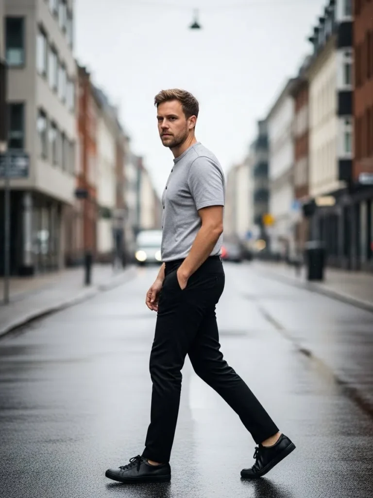 A fitted gray shirt is styled with black trousers and clean dark shoes for a sleek finish.
