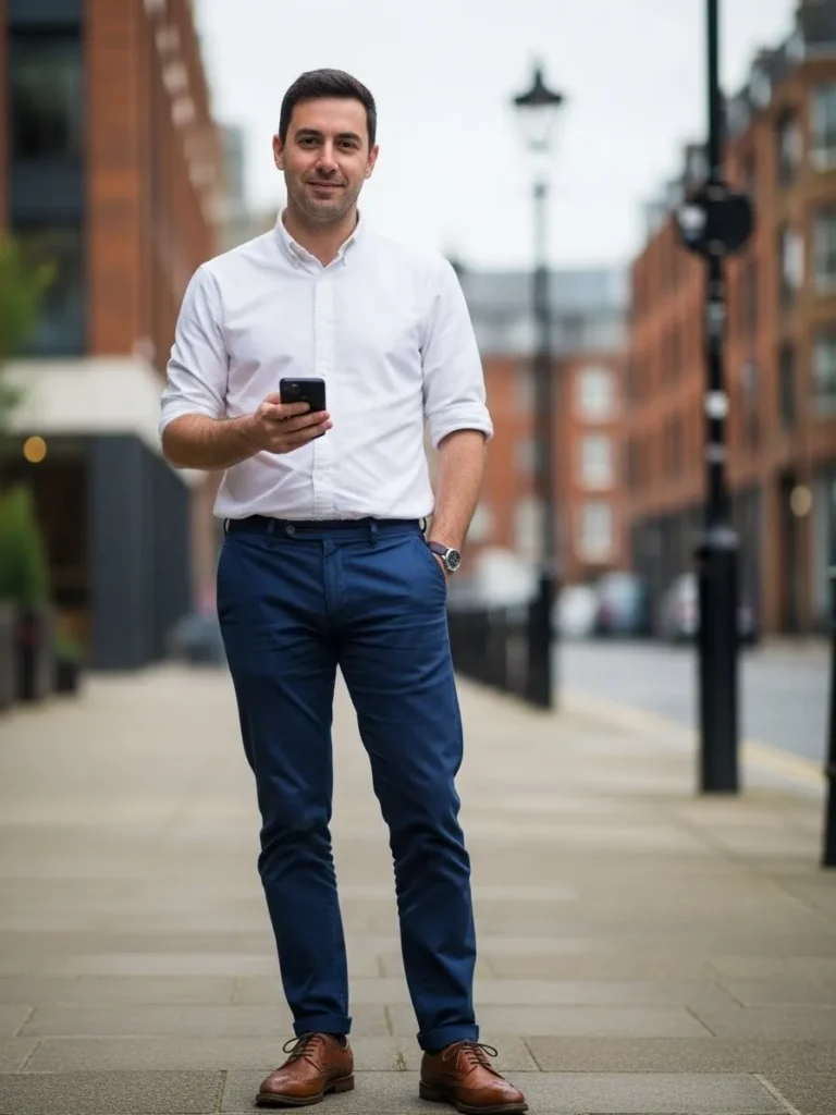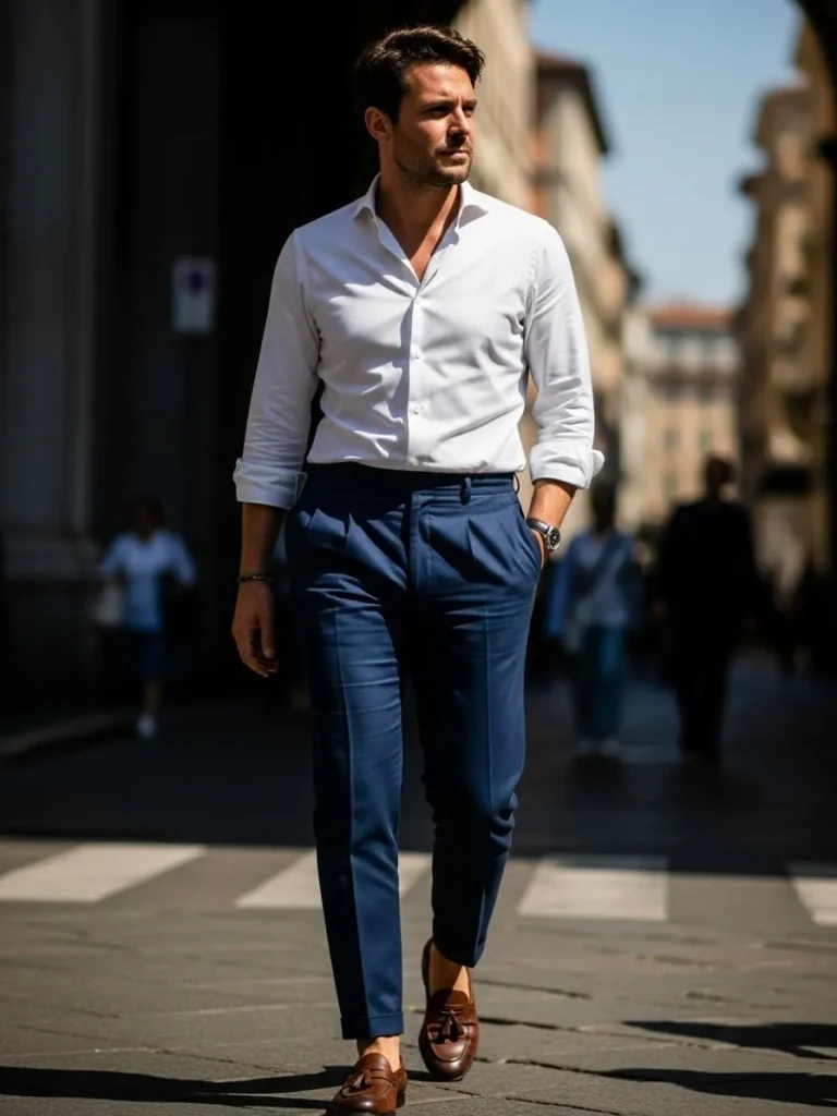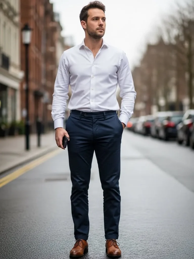 This outfit features a clean white shirt styled with navy tailored trousers and brown leather shoes.
