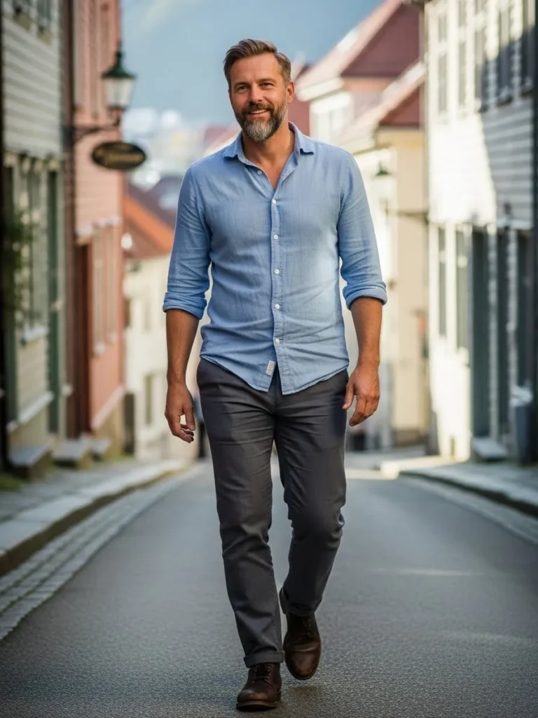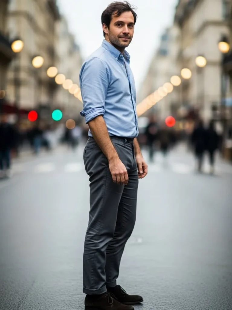 This outfit combines a light blue shirt with dark gray trousers and simple leather shoes.