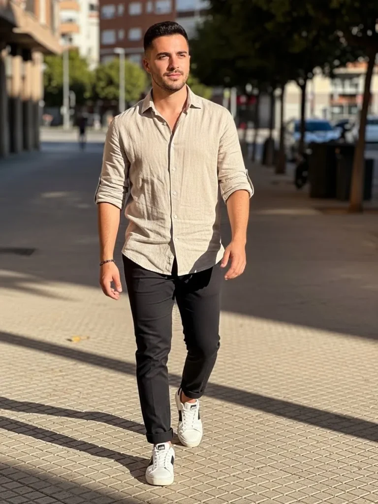 This look pairs a beige shirt with dark trousers and clean white sneakers for a softer semi formal feel.