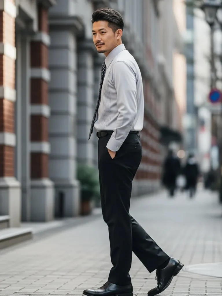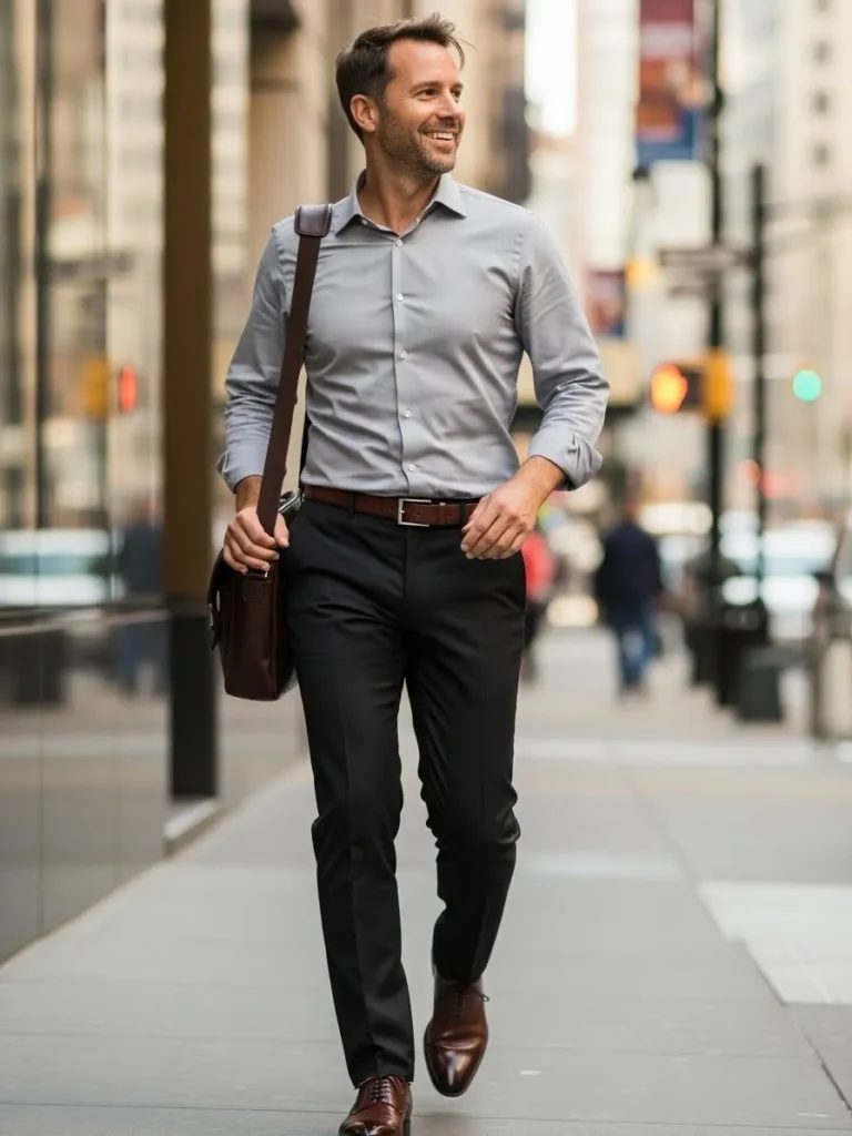 A light gray shirt is worn with black trousers and polished shoes for a clean city look.