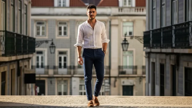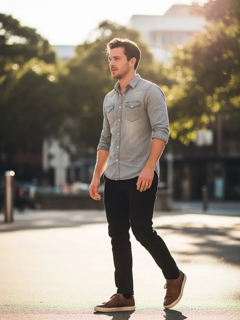The shirt feels casual but clean, giving the outfit a modern semi formal feel that suits daytime settings.