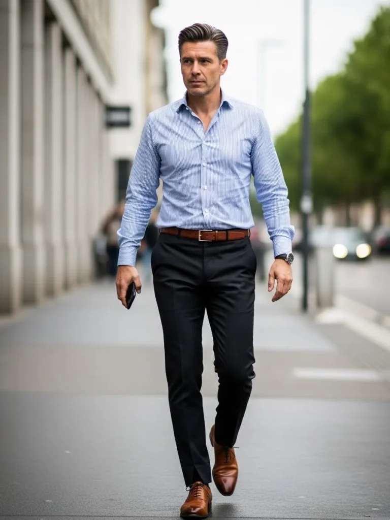 This look combines a light blue shirt with dark slim trousers and classic leather shoes.