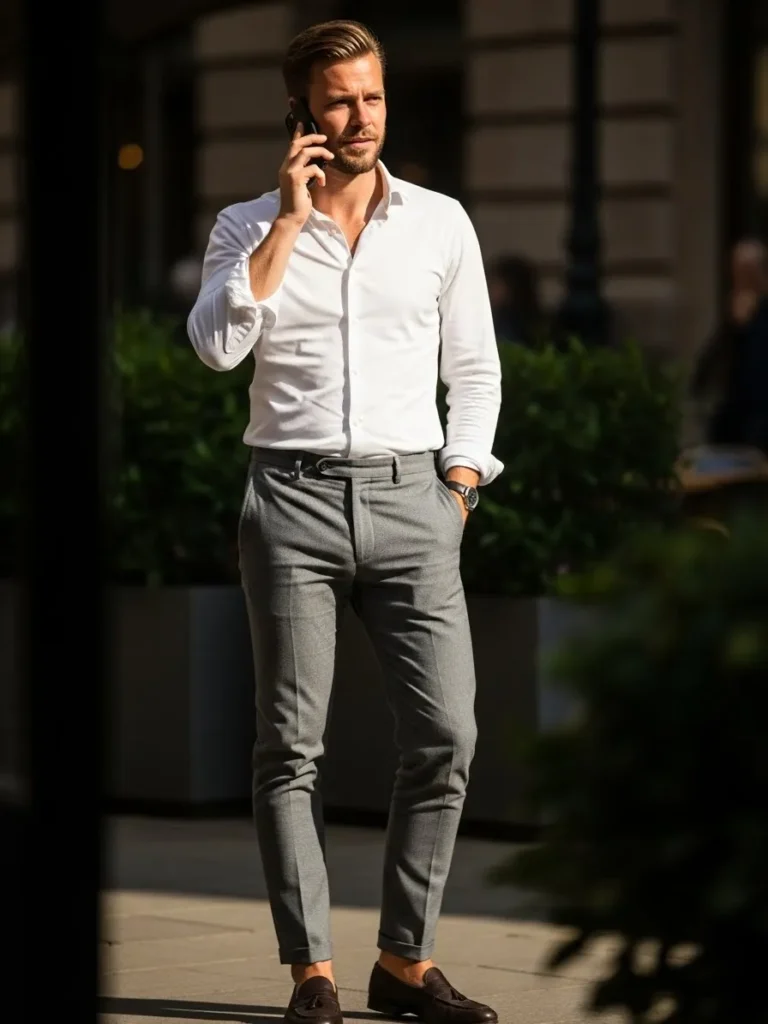 Soft Gray Shirt With Dark Slim Pants