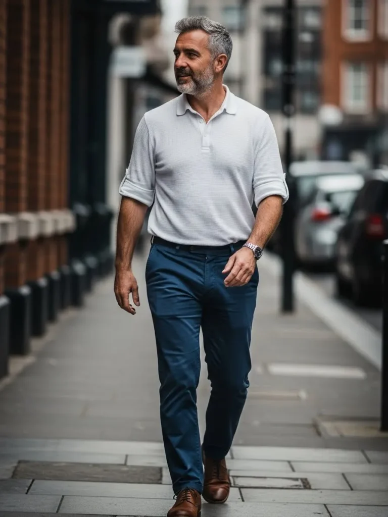 This look features a light neutral polo style shirt paired with navy trousers and brown shoes.