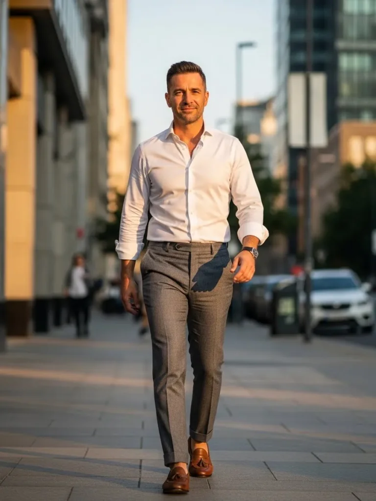 This look features a crisp white button up shirt styled with gray tailored trousers and brown leather shoes.