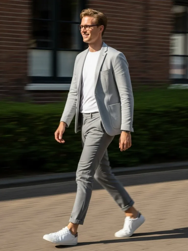 This look features a soft gray suit styled with a white T shirt and white sneakers.