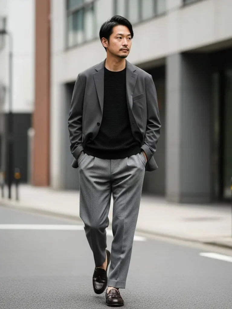 This outfit combines a charcoal blazer with a black top and gray trousers.