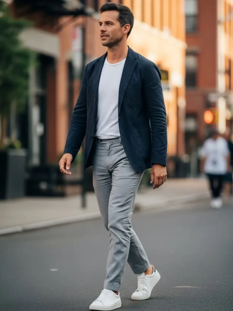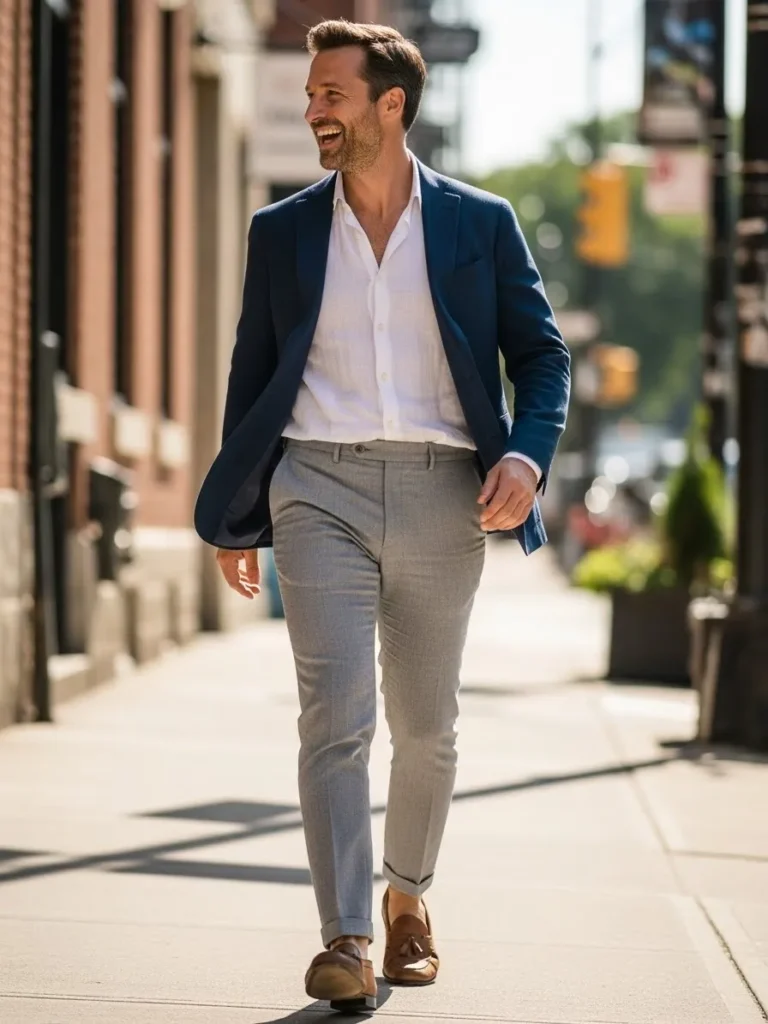 This look pairs a navy blazer with a white shirt and light gray trousers.