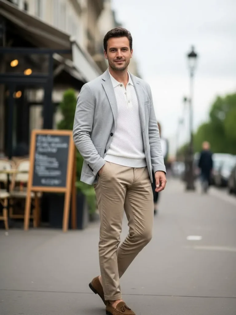 This outfit features a light gray blazer paired with a white shirt and beige trousers.