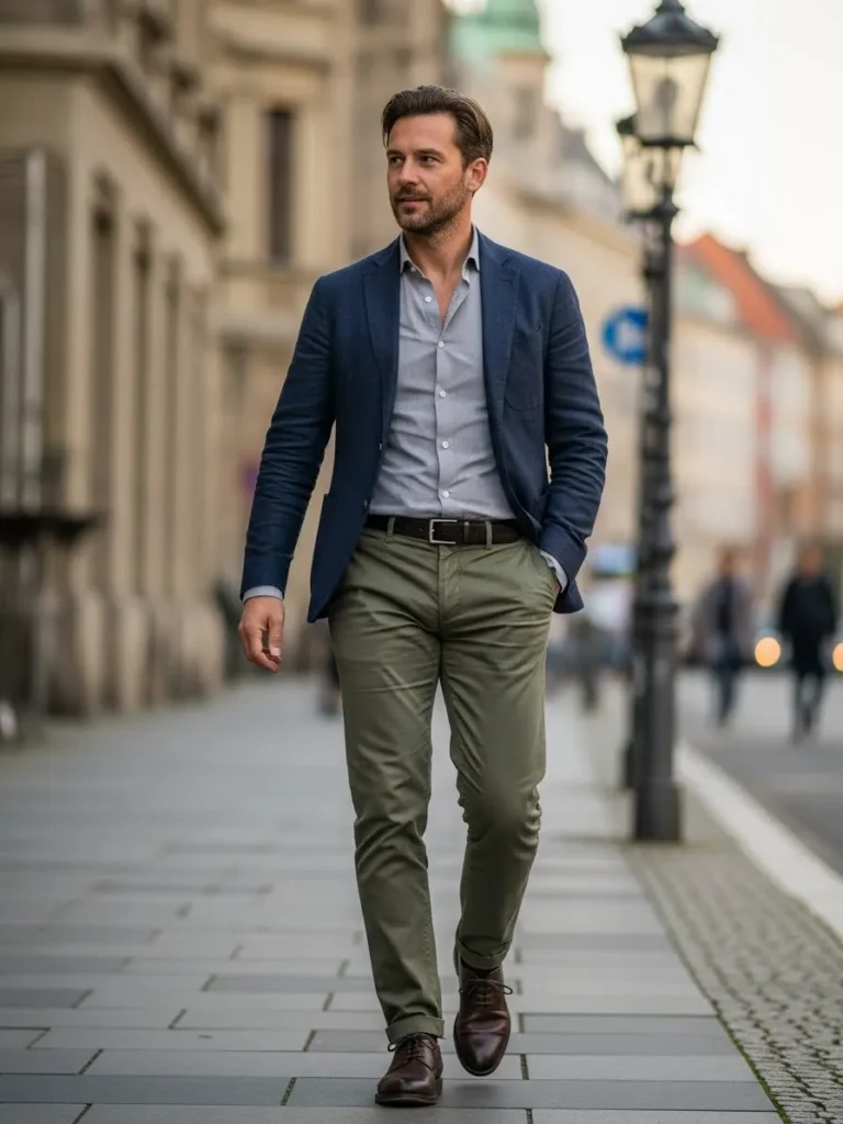 This outfit pairs a navy blazer with a light blue shirt and olive green trousers.