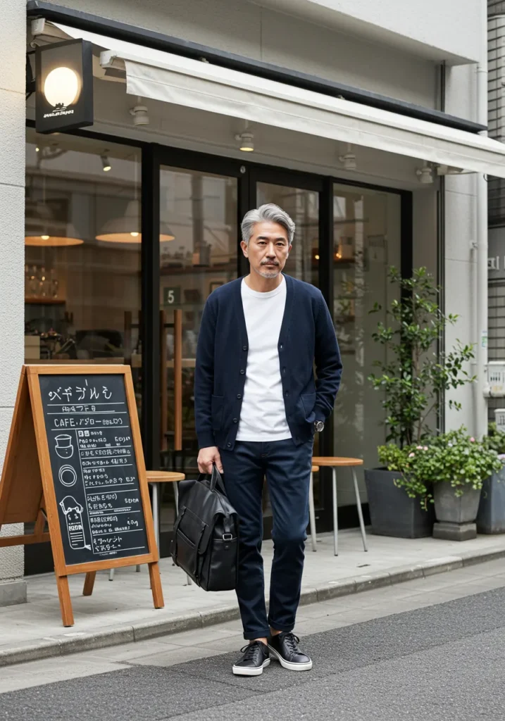 Here we have a clean and timeless look built around a navy cardigan layered over a crisp white t-shirt. Paired with slim navy trousers and black sneakers, the outfit is neat without being fussy. A leather backpack adds a practical touch, making it a great choice for an errand day or casual outing.