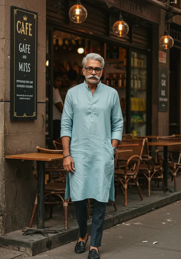 This outfit features a light blue kurta worn over slim dark trousers, paired with sleek black loafers. The traditional cut is simple but elegant, giving off a sophisticated and relaxed look for city life or casual dining.