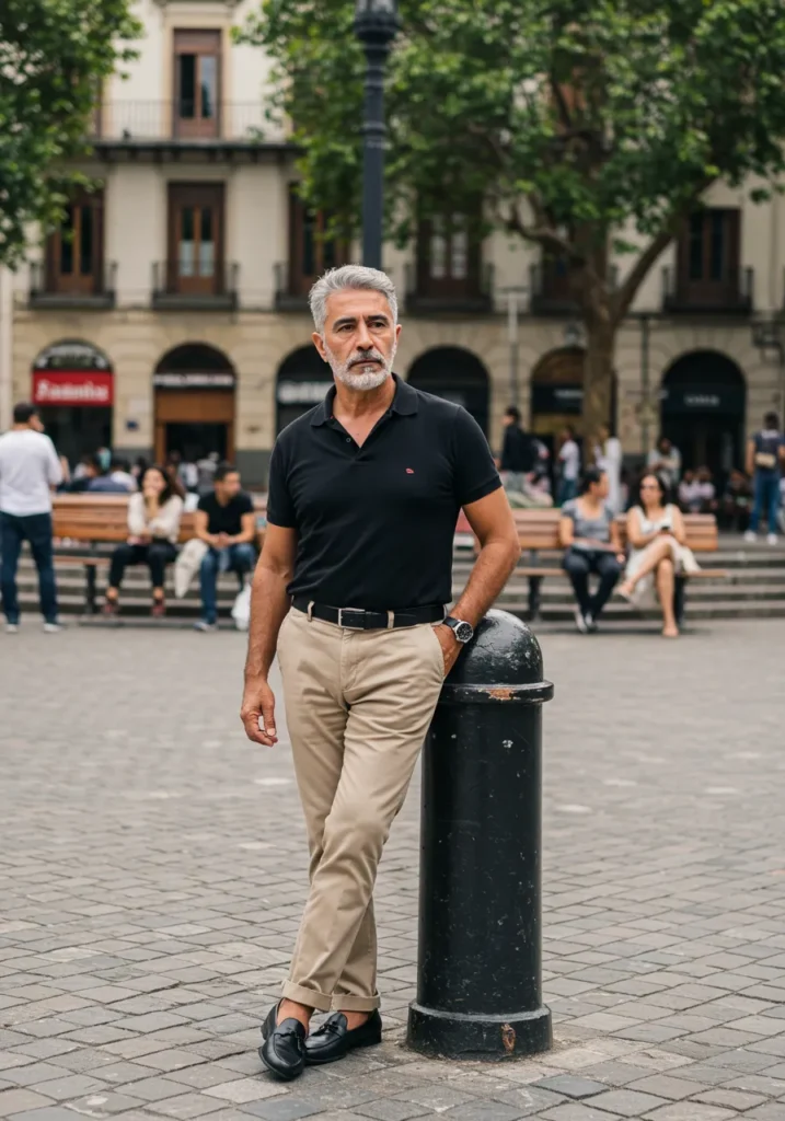 This outfit blends a fitted black polo shirt with beige chinos, paired with polished black loafers and a simple black belt. The man’s relaxed posture and minimal accessories make it look sharp without being fussy.