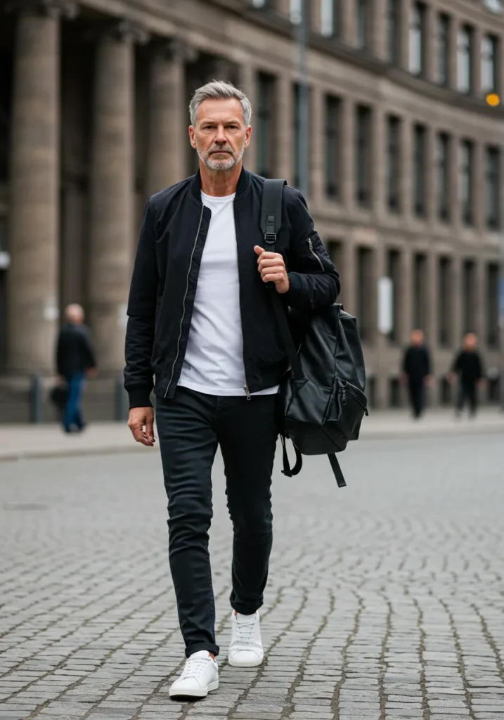 Here we have a black bomber jacket layered over a crisp white t-shirt, styled with slim black jeans and white sneakers. A black backpack adds practicality, making it ideal for city errands or casual outings.