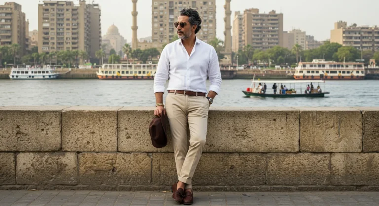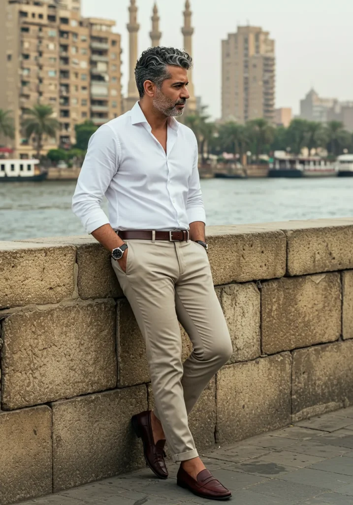 This outfit features a crisp white button-down shirt tucked into beige trousers, paired with brown loafers and a matching belt. Rolled-up sleeves add to the relaxed yet smart vibe, while the riverside backdrop completes the timeless appeal.