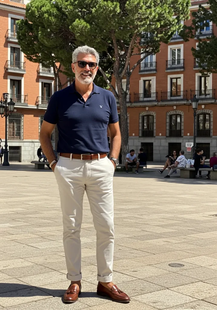 This outfit combines a navy polo shirt with crisp beige trousers, finished with brown leather loafers and a matching belt. Sunglasses add a polished edge while keeping it casual enough for a day out in the city. The look feels both timeless and effortlessly cool.