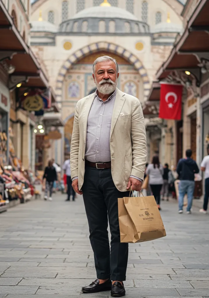 Here we see a man in a light beige blazer layered over a pale button-up shirt, paired with dark trousers and classic loafers. He carries a shopping bag, looking refined yet approachable as he strolls through a bustling market street.