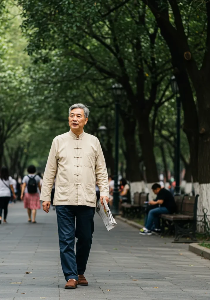 This look features a light tan Mandarin-style jacket with buttoned detailing, paired with navy trousers and brown loafers. The outfit feels rooted in tradition while still looking modern and wearable, especially for a relaxed city walk.