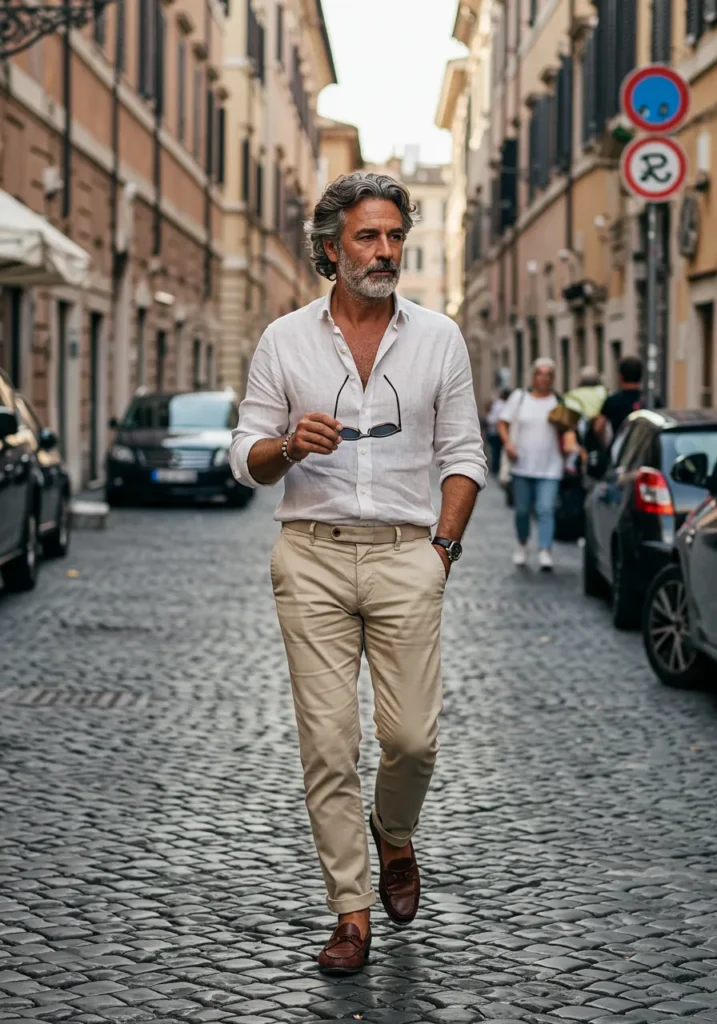 This outfit pairs a crisp white linen shirt with beige trousers, finished with brown loafers. The shirt is worn slightly unbuttoned, adding a breezy feel, while sunglasses in hand bring a touch of cool sophistication. The cobblestone street backdrop only adds to the timeless charm.
