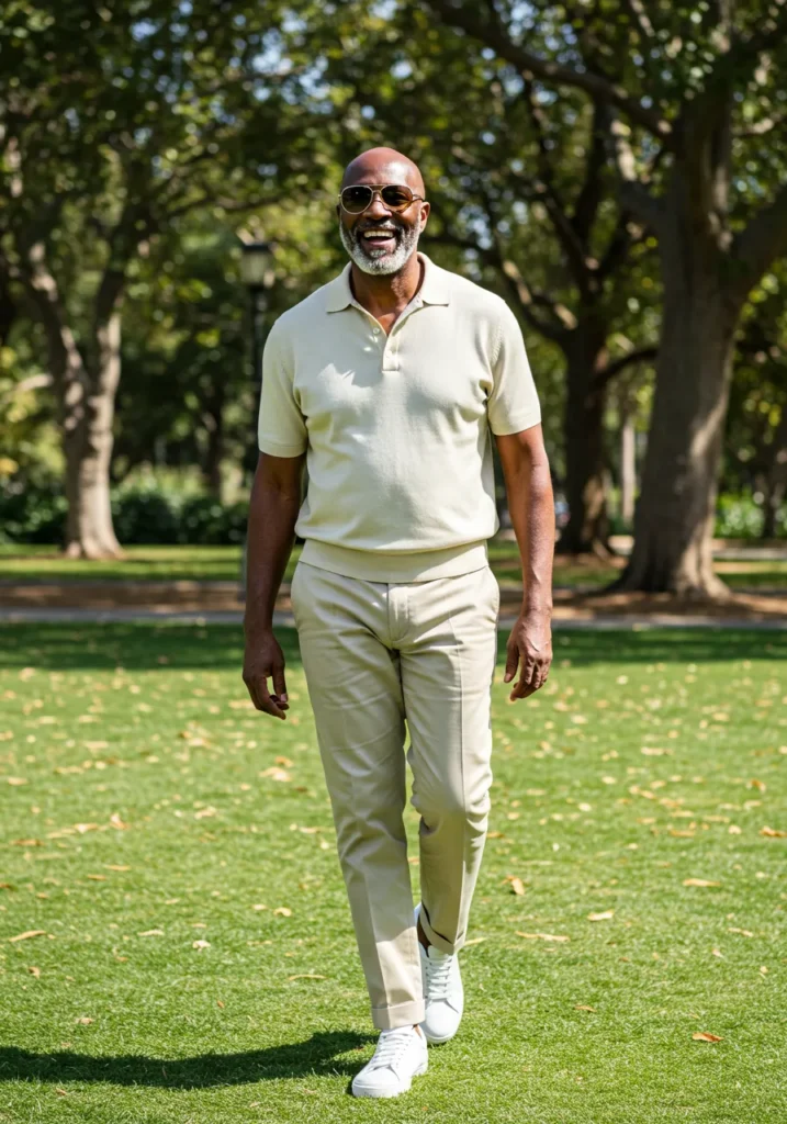 This look is all about clean monochrome styling. A beige polo shirt is tucked neatly into matching beige trousers, finished with fresh white sneakers. The man’s aviator sunglasses add a cool, confident edge, while the neutral palette makes the whole outfit look refined.