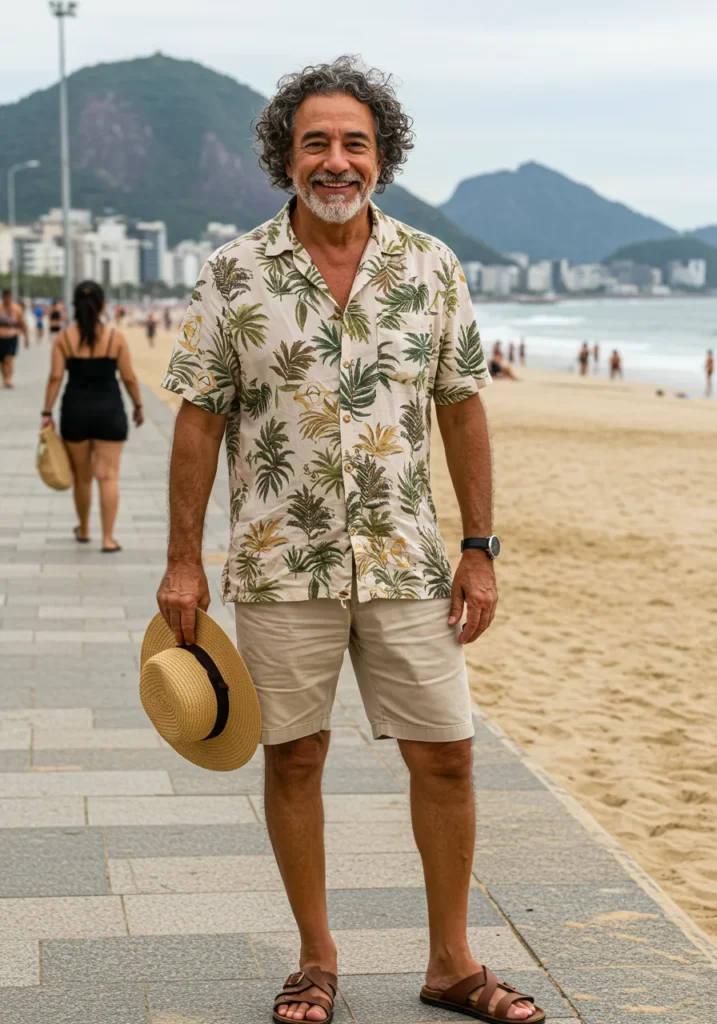 Here’s a breezy, laid-back summer look with a palm-print short-sleeve shirt in muted greens and creams. The shirt is paired with beige shorts, brown sandals, and a straw hat held casually in hand. The outfit feels relaxed yet fun, perfect for beachside strolling.