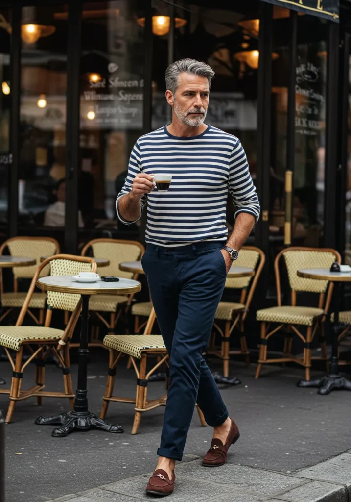 This outfit leans into classic Parisian style with a navy-and-white striped long-sleeve top tucked into slim navy trousers. Paired with rich brown loafers and a simple wristwatch, the look feels timeless. Holding an espresso in hand just completes the chic vibe.