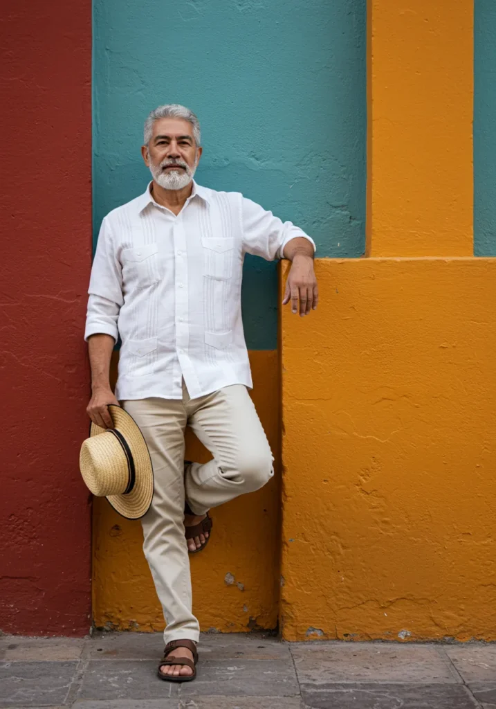 This look features a traditional white button-down guayabera shirt, styled with beige trousers and brown leather sandals. A straw hat is carried casually, adding both practicality and flair. The rolled-up sleeves give it that relaxed, warm-weather energy.