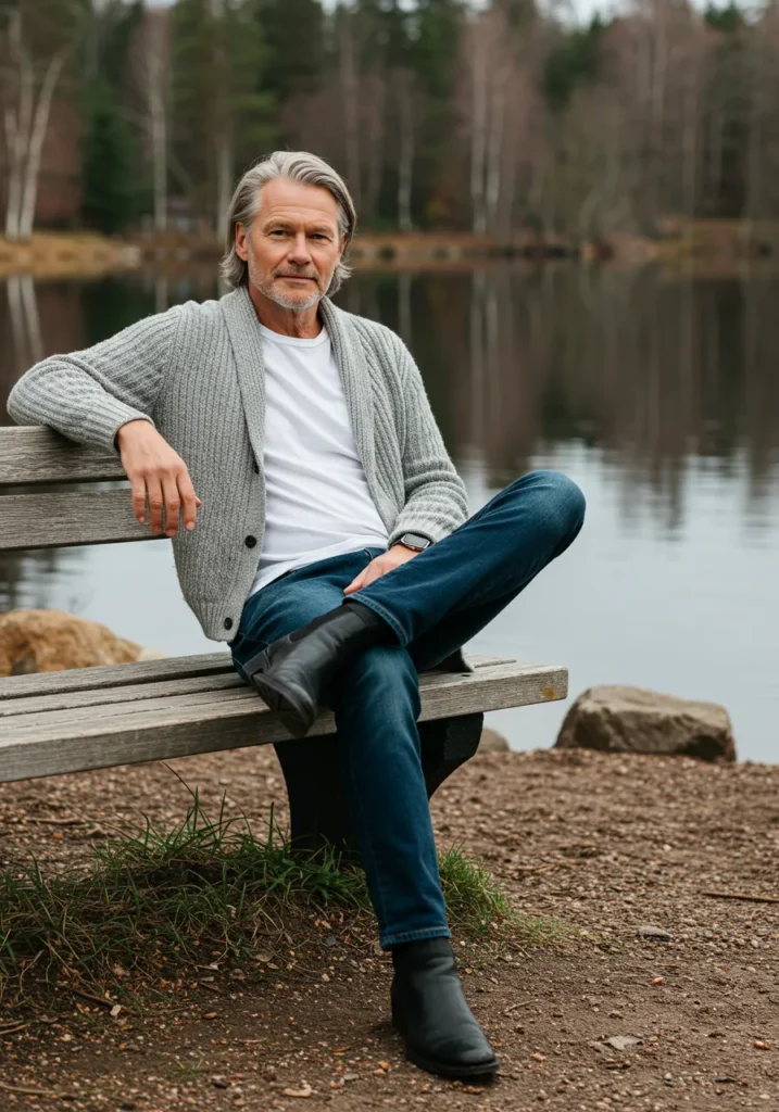 I really like how approachable yet handsome this look feels. The cardigan gives off a cozy, lived-in vibe, but the boots and jeans keep it sharp. Honestly, it’s the kind of outfit that makes “relaxed outdoors” look incredibly stylish.