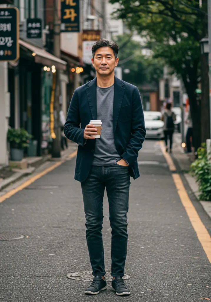 I love how this outfit balances comfort with sophistication. It shows that you don’t need a tie or formal shirt to look sharp. The blazer instantly elevates the jeans-and-tee combo, and the sneakers keep it grounded in everyday wear. To me, it’s the perfect “coffee run but still stylish” look.