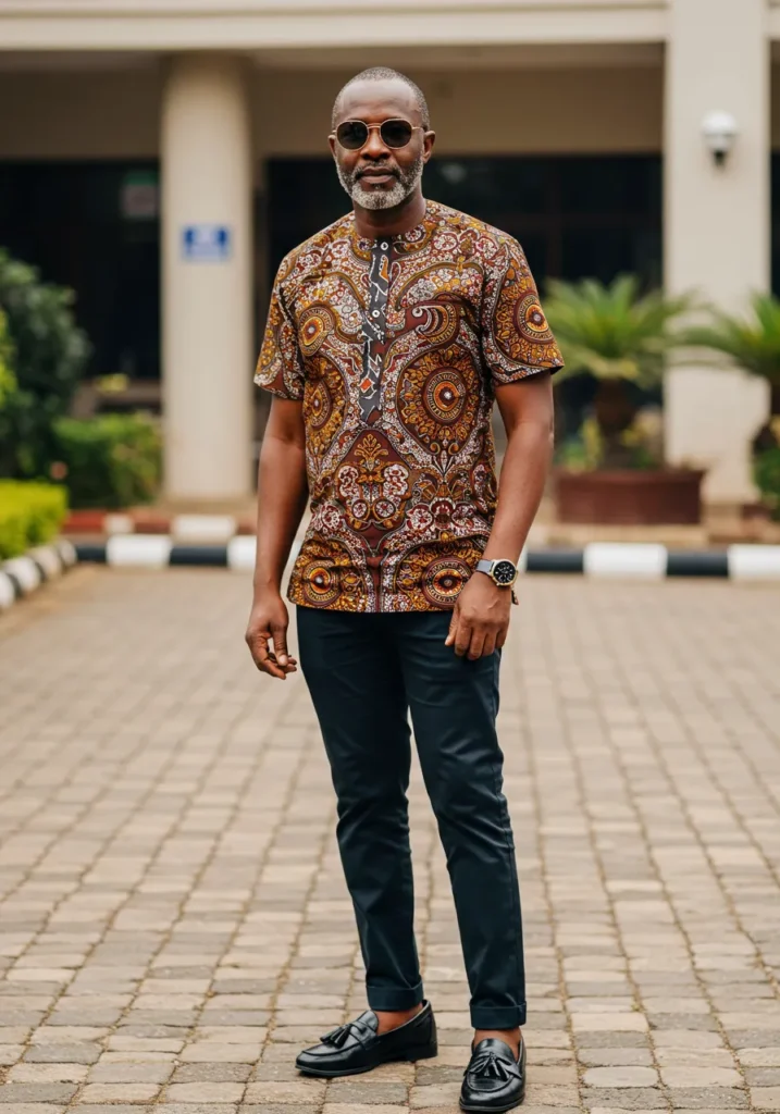 This look showcases a richly patterned short-sleeve shirt in warm earth tones, paired with slim black trousers and tassel loafers. The round sunglasses and wristwatch give it a modern twist, while the print itself brings personality and flair.