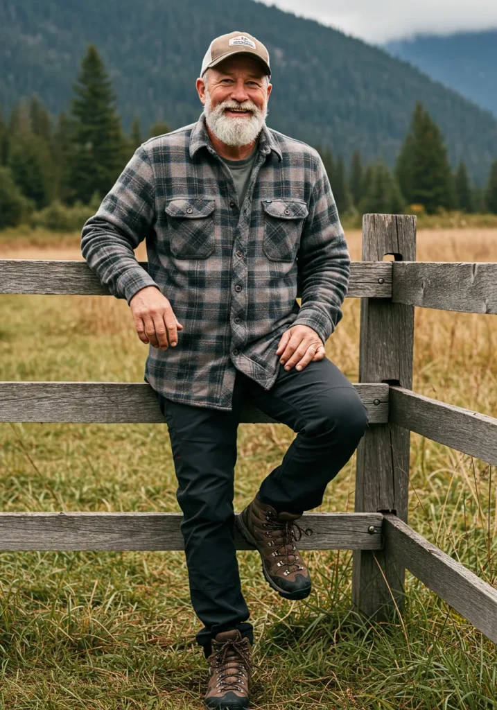 Here we see a rugged flannel-style plaid shirt layered over a t-shirt, combined with dark outdoor trousers and sturdy brown hiking boots. A baseball cap ties the outfit together, creating a relaxed and approachable look perfect for a countryside stroll.