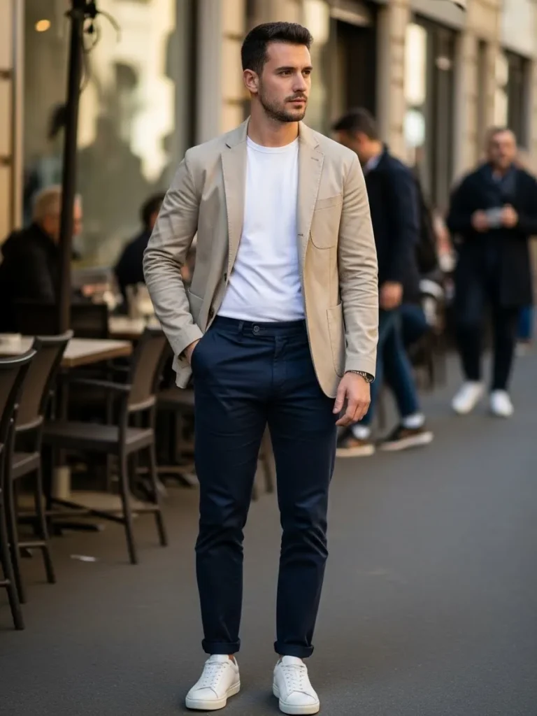 This look features a navy blazer worn over a white tee, paired with light trousers and crisp sneakers. The color contrast feels fresh and relaxed, and the fit looks effortless but clean. It gives off an easy café ready feel that still looks smart.