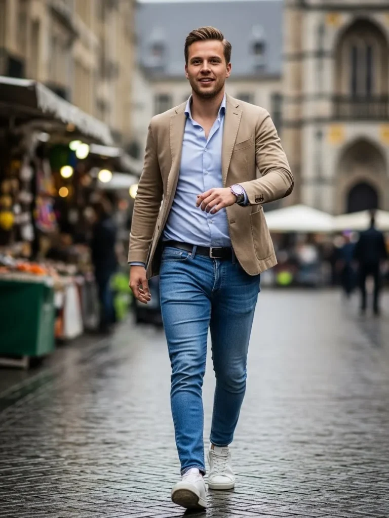 Here we see a beige blazer styled with an open light shirt, blue jeans, and white sneakers. The color palette feels warm and fresh, and the fit looks relaxed but neat. It has that effortless city style vibe.