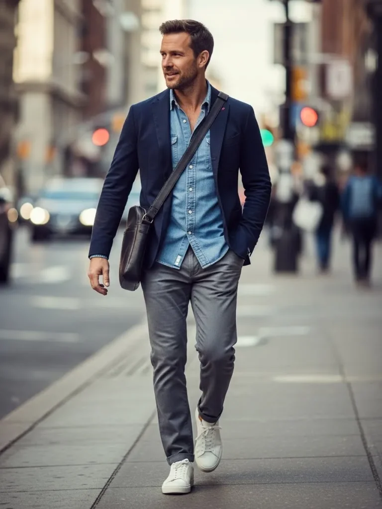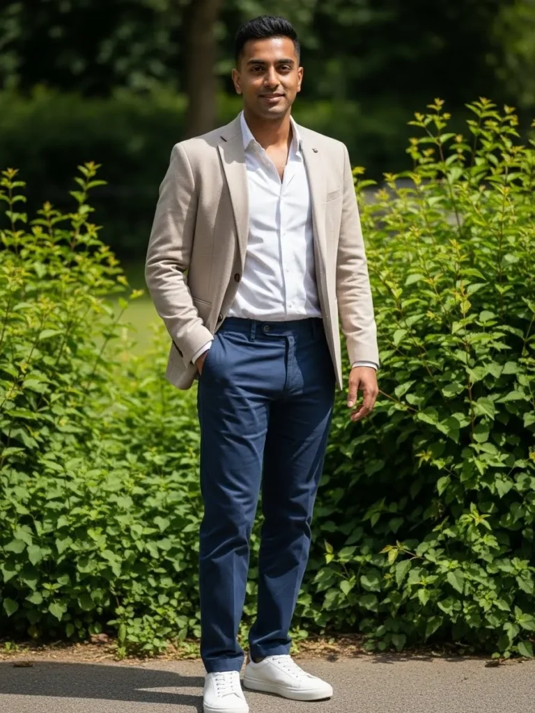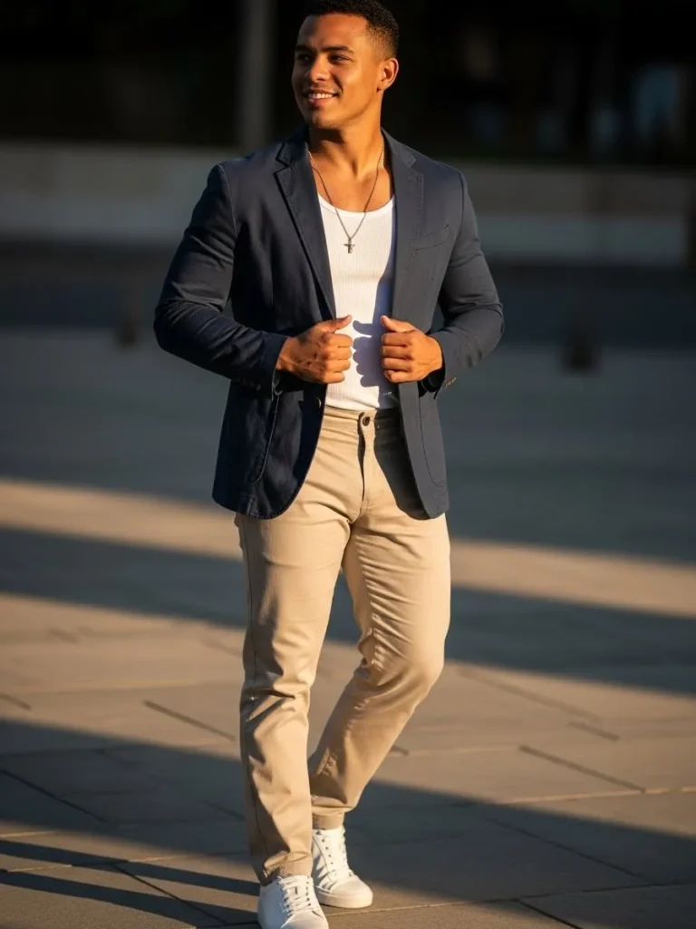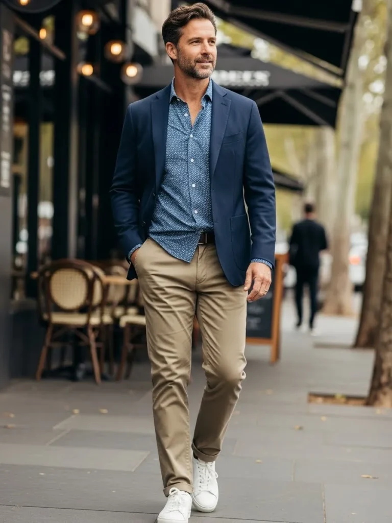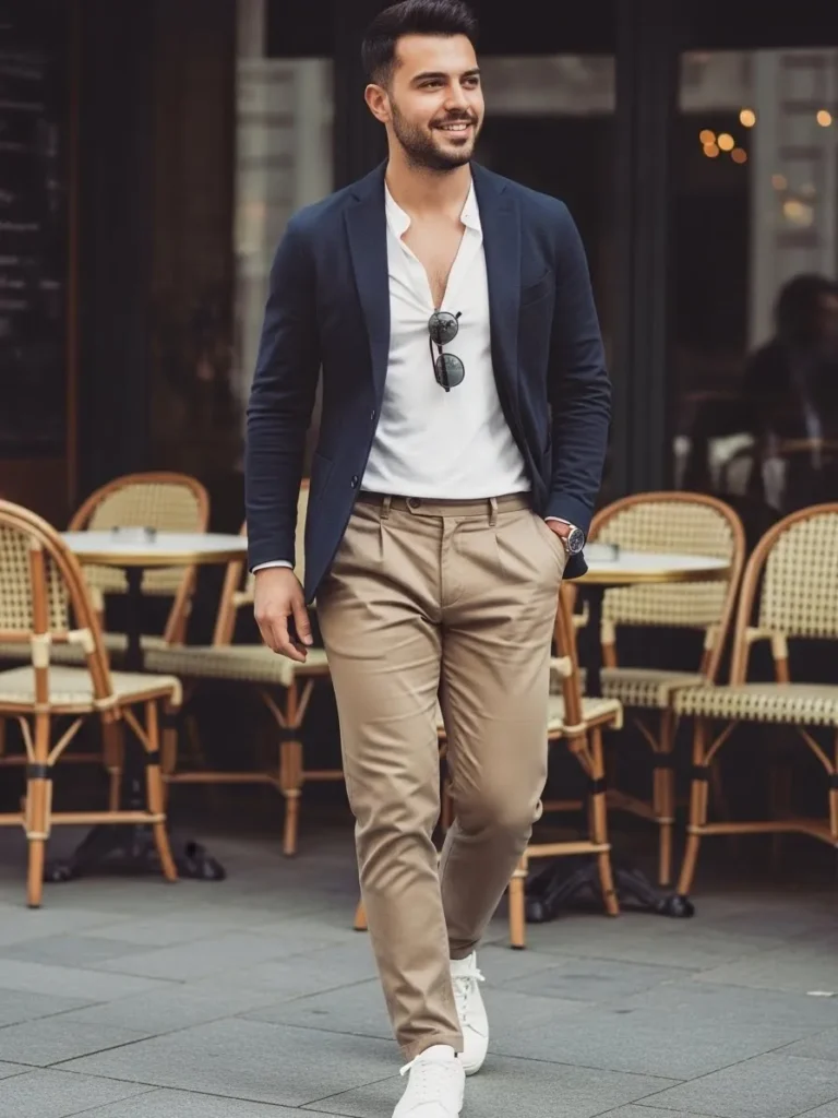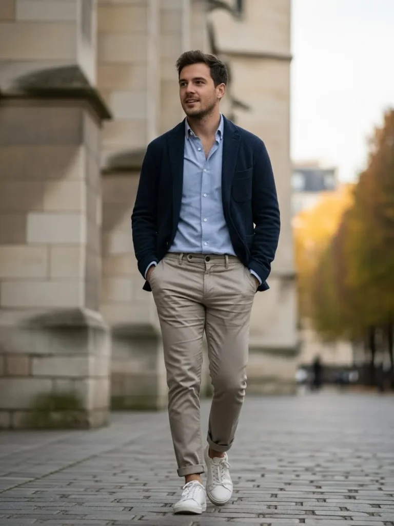 This look combines a navy blazer with a light blue shirt, tailored beige trousers, and white sneakers. The mix of classic pieces and casual footwear makes it feel modern and approachable. Everything fits cleanly without looking stiff.