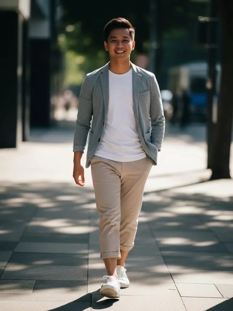 This look pairs a light blazer with a crisp white shirt, dark trousers, and clean sneakers. The colors feel fresh and classic, and the overall fit looks neat but relaxed. It feels polished without feeling formal.