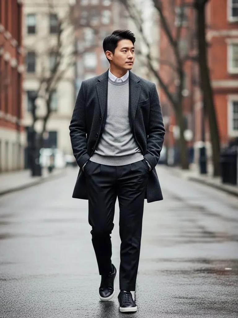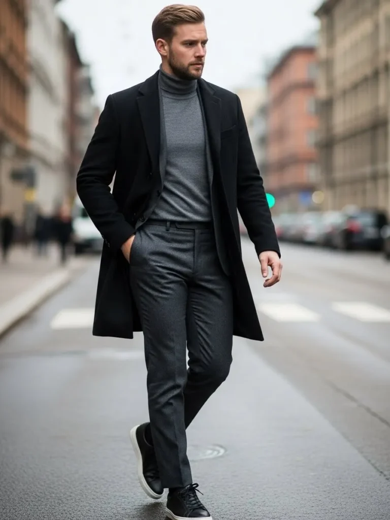 This look features a long dark coat layered over a fitted top, dark trousers, and sneakers. The silhouette feels sleek and modern, while the sneakers keep it grounded and relaxed. It has a cool city feel.