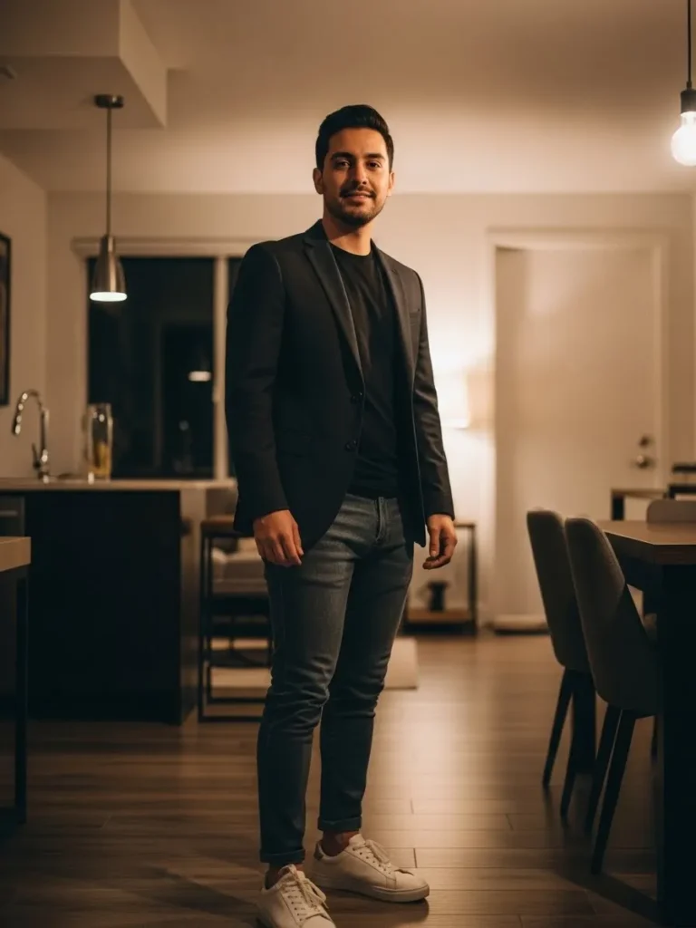 This outfit combines a textured blazer with a simple tee, slim jeans, and classic sneakers. The darker tones make it feel sleek, while the casual base keeps it approachable. It looks modern and put together.