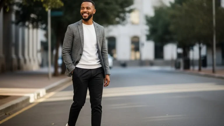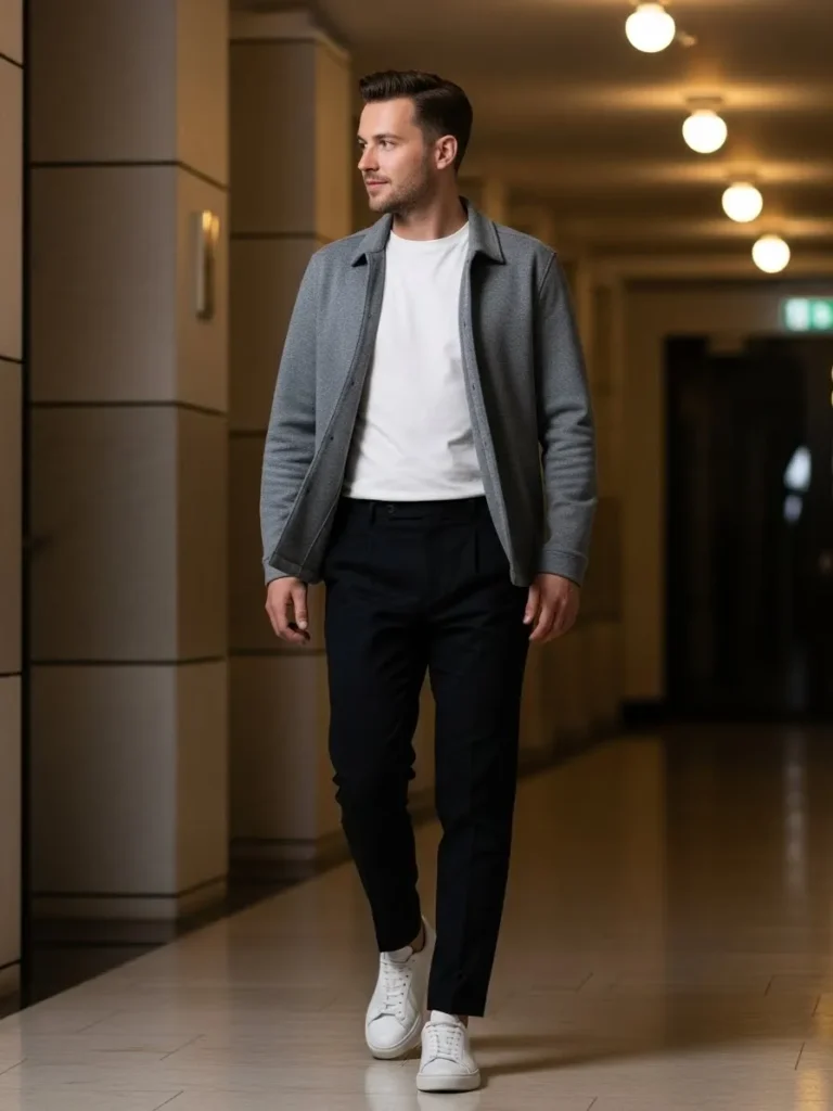 This outfit features a light grey jacket layered over a crisp white tee, paired with slim black trousers and clean white sneakers. The fabrics look soft and structured at the same time, giving the outfit a modern and easy feel. It comes across polished but still very relaxed.