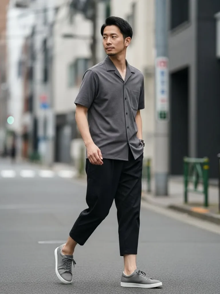 Here we see a short sleeve button up shirt styled with cropped dark trousers and sleek sneakers. The fit feels airy and relaxed, while the clean lines keep it sharp. The overall vibe feels effortless and very current.