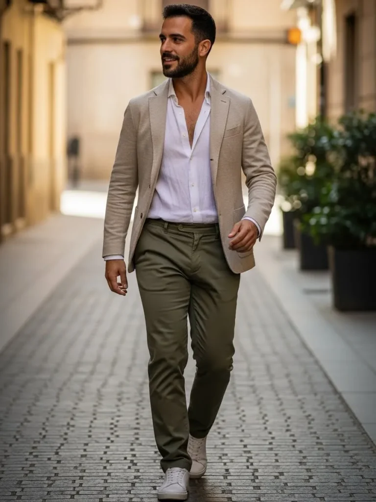 This look pairs a beige blazer with an open collar shirt, tailored trousers, and clean sneakers. The warm tones give it a relaxed and refined feel. Everything fits neatly without feeling stiff.