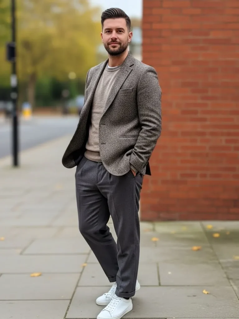 This outfit features a relaxed blazer layered over a casual shirt, paired with tailored trousers and white sneakers. The mix of textures adds interest without feeling busy. It looks modern and well balanced.