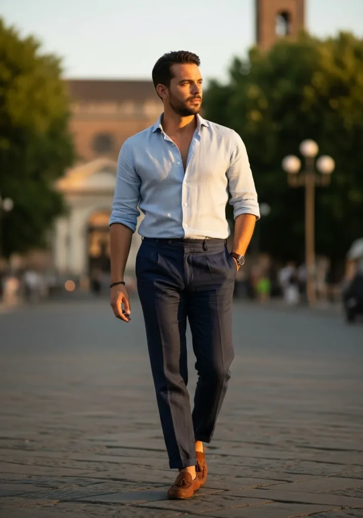 This look pairs a light linen shirt worn open at the collar with tailored blue linen trousers and loafers. The shirt feels relaxed while the pants bring in structure and color contrast. The fabric choices keep everything breathable and easy to wear even on humid days.
