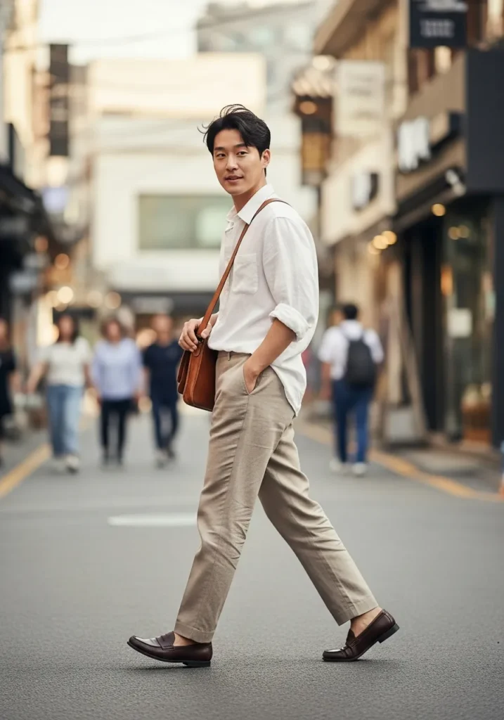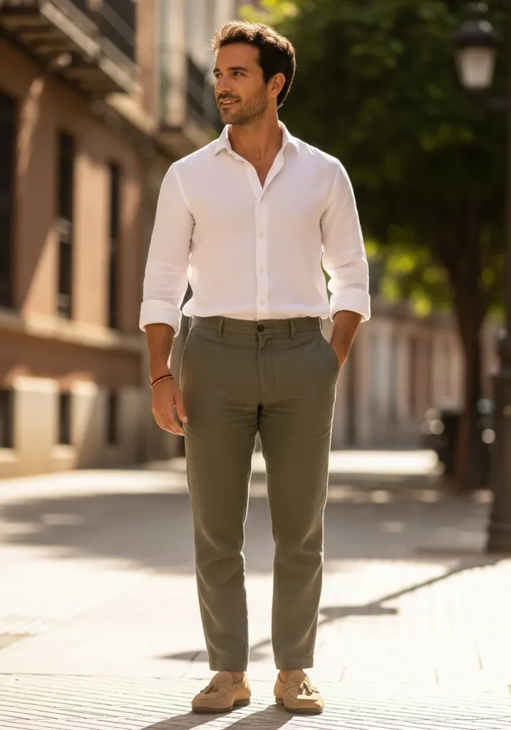 This outfit keeps things simple with a crisp white linen shirt paired with olive green linen trousers and light loafers. The shirt is worn open at the collar which keeps it relaxed and breathable. The muted green pants add just enough color while staying neutral and wearable.