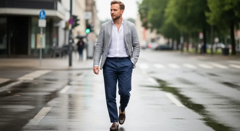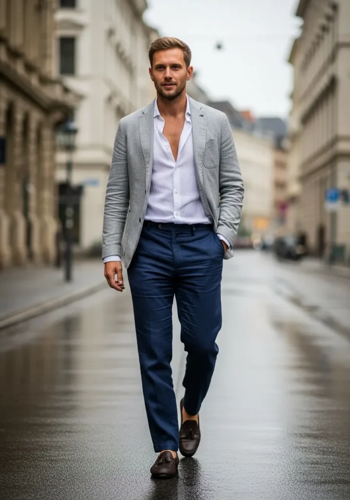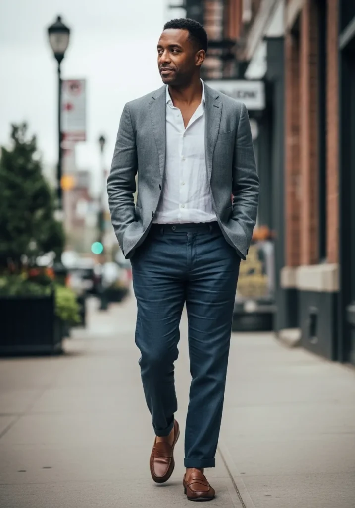 This look features a charcoal linen blazer layered over a white shirt with navy linen trousers and brown loafers. The darker tones feel grounded while the lightweight fabrics keep everything cool and comfortable. The blazer adds structure without looking heavy or formal.