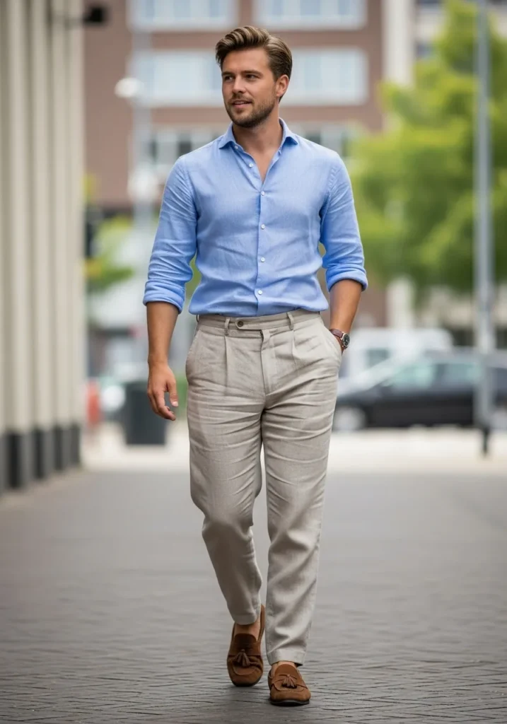 This look features a soft light blue linen shirt paired with sand colored linen trousers and brown loafers. The colors feel fresh and summery while the fit keeps it polished. Everything about this outfit feels light and breathable which is ideal for hot days.