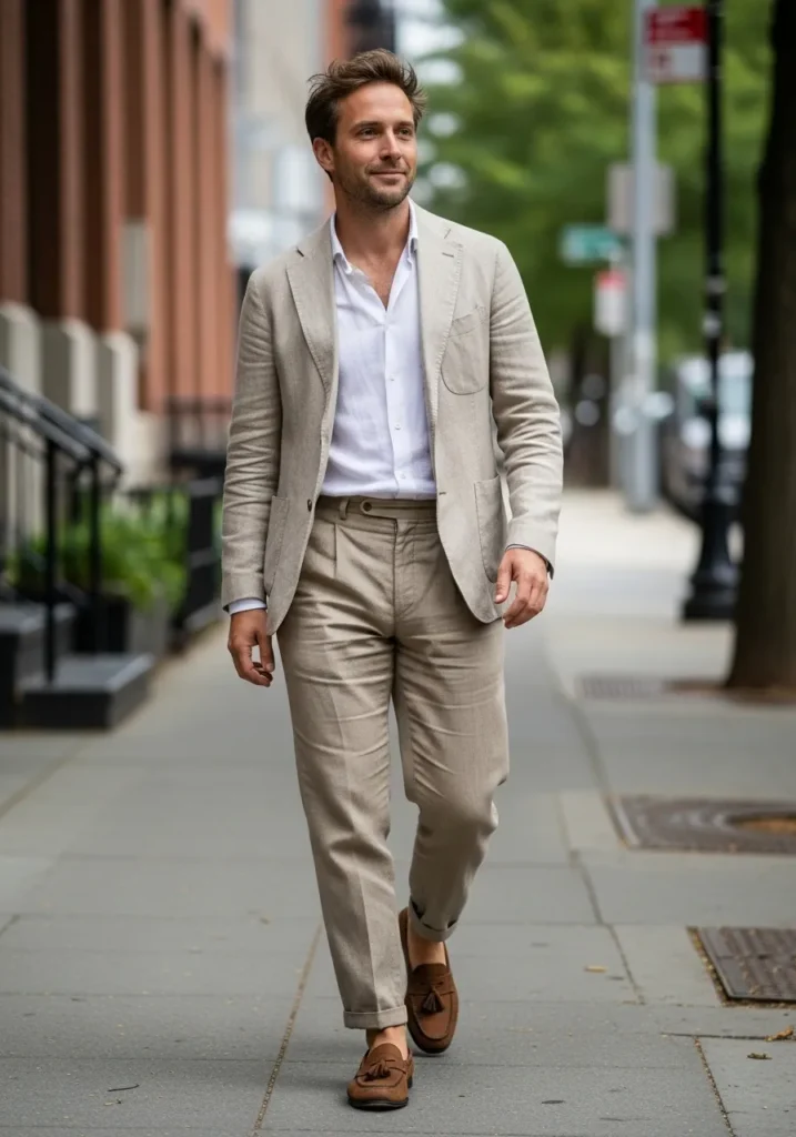 This outfit brings together a soft neutral linen suit worn with a crisp white shirt and brown loafers. The suit feels relaxed rather than formal thanks to the lightweight fabric and easy fit. The overall look is clean and well balanced without feeling overdressed.
