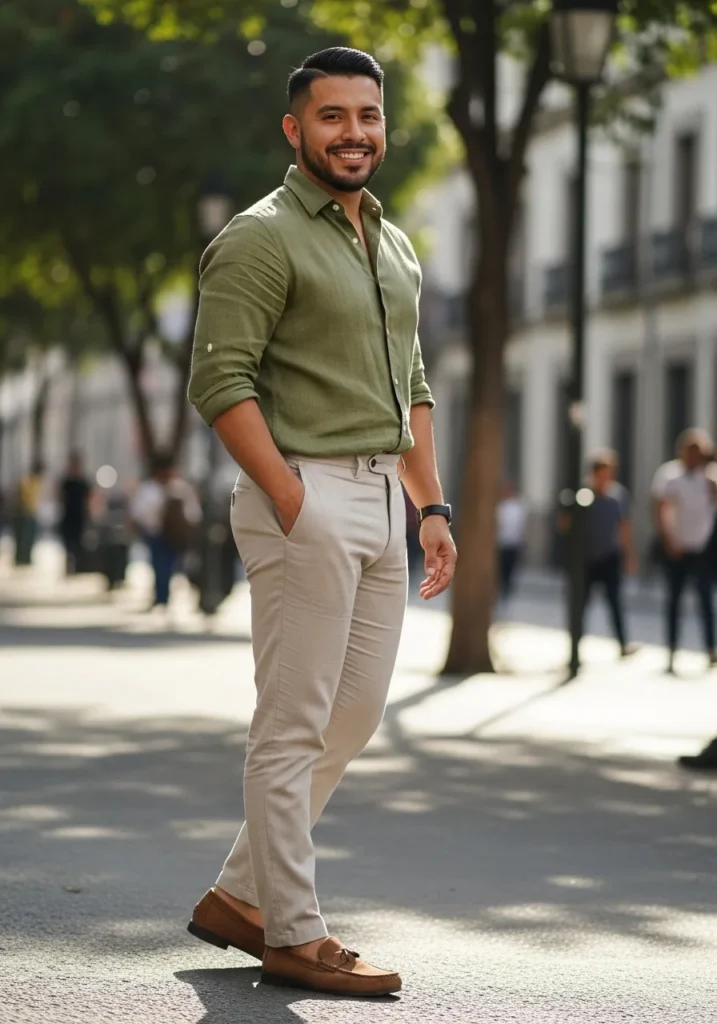 This outfit features a sage green linen shirt paired with light beige linen trousers and brown loafers. The shirt has a relaxed fit that allows the fabric to breathe while still looking sharp. The neutral pants balance the soft color perfectly and keep the whole look grounded and clean. Everything about this outfit feels calm and stylish without being boring.