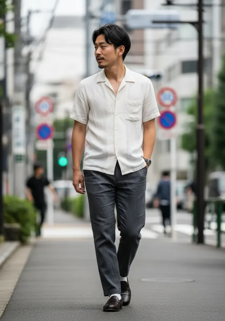 This outfit features a short sleeve off white linen shirt paired with charcoal linen trousers and sleek loafers. The shirt keeps things cool and casual while the darker pants add balance and a business casual edge. The fit is relaxed but intentional which keeps the look modern and wearable.