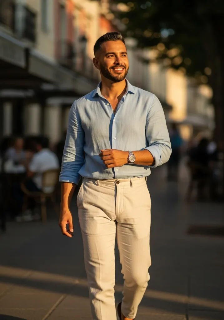 I love how this outfit feels timeless without trying too hard. The contrast between the white shirt and navy pants always looks fresh and flattering. It is one of those looks that instantly makes a man appear put together even in summer heat. This is the kind of outfit that feels confident and quietly attractive which is always a win.